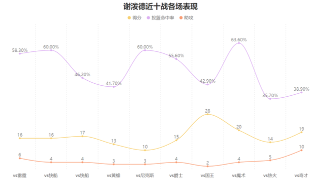对于谢泼德即使是支持火箭的人也对他褒贬不一,他某些时候能够突然爆发拯救火箭于水火,有时候也能投不进+防不住完全负面作用,对阵奇才时谢泼德虽然命中率不高但以19分10助攻6抢断的表现扛起了火箭,即使是本赛季的他各项表现也均在稳步上升,而近10战的谢泼德更是渐入佳境: