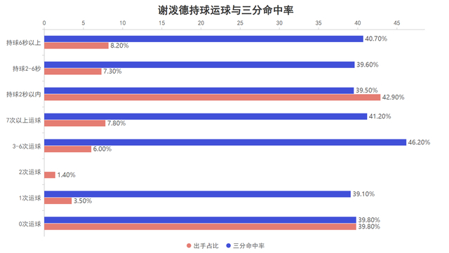 当然,谢泼德在自己的舒适圈三分线外还是游刃有余的,与其他无球射手不同,他除了场均出手次数极少的2次运球后出手,其余无论是接球不运球就投还是持球运球后的三分出手均能保持40%左右的命中率,虽然他的进攻并不全面但无比适合现有的火箭体系,现在的火箭太需要能在三分线外惩罚对手的射手了。