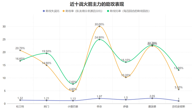 另一方面谢泼德也开始展现出自己的组织能力,近十战谢泼德的助攻率达到了22.4%,这意味着他在场时队友22.4%的得分都来自他的助攻,22.7%的助攻比率意味着他在场时每百回合有22.7个回合是有助攻的回合,这两项表现均位于火箭近十战场均出战15分钟以上7名主力的第二高,而2.05的助攻失误比更是高居主力第一,他也是火箭目前助攻最为高效的。