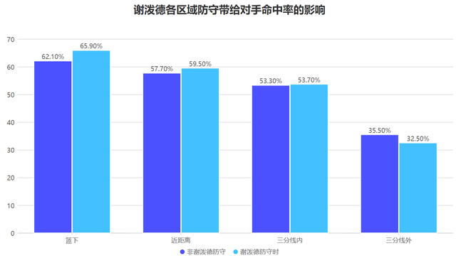 在篮下区域谢泼德的命中率仅有56%,这个数字看起来不低但在篮下区域命中率至少超过60%才算合格,并且作为投手他的中距离命中率仅有38.3%,整个进攻端只有非篮下的三秒区与三分线外达到优秀线,因此他进攻端最擅长的是突破到三秒区附近完成跳投与投三分,这样的进攻风格极为依赖手感和状态很难保持稳定。